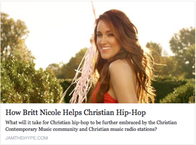 How Britt Nicole Helps Christian Hip-Hop April 19, 2014June 27, 2019 Jaymie Nicole Britt Nicole is paving the way for Christian hip-hop to have more exposure! Check out this awesome article that gives props to our girl! 🙂 READ: How Britt Nicole Helps Christian Hip-Hop Share this: Click to share on X (Opens in new window) X Click to share on Facebook (Opens in new window) Facebook Like Loading... Published by Jaymie Nicole View all posts by Jaymie Nicole