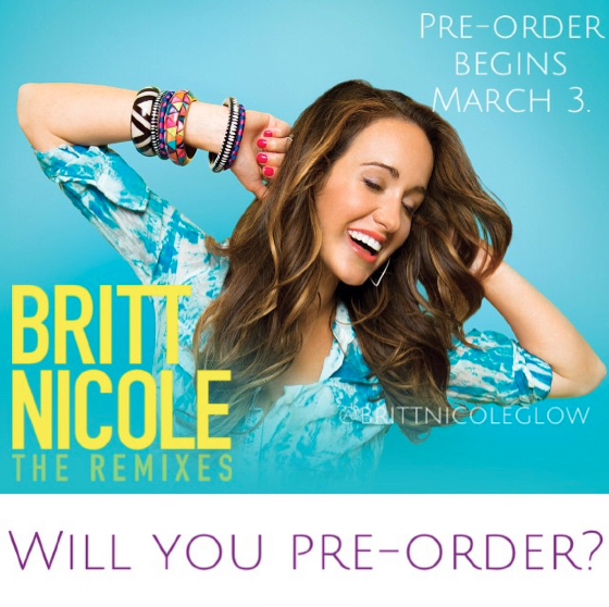 Britt Nicole recently announced that pre-orders for her upcoming album “The Remixes” will begin on March 3, 2015. For those of you who cannot afford to purchase it right away, you will be able to listen to her album on Spotify as well! 🙂 Which song are you looking forward to the most?