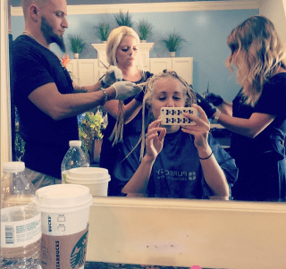 The final product? Check out her beautiful blonde locks in the picture below on the far left! 🙂