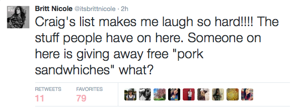 Britt Nicole is currently working on a new song with her husband at the time of this posting. EXCITING!!!! 🙂 However, she admitted to her fans that she is having trouble focusing. Why, you ask? Craigslist! Check out her two hilarious posts below! I know they put a smile on my face! 🙂