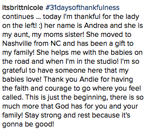 We are a little behind on re-posting Britt Nicole’s thankful posts on here, so we will be playing catch-up. š On May 10th, Britt Nicole shared that she was thankful for her Aunt Andrea. š Check out her post below!
