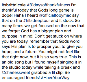 Britt Nicole was recording in the studio with her husband late one night… well, MANY nights lately. Haha! But one of her older songs “Have Your Way” (my favorite!) came to mind as she was taking a break so she started playing it. Luckily for us, her husband Josh took a moment to capture the end! It sounds even more beautiful live! I really hope that she incorporates this into some of her upcoming shows! Check out the video and her thankful post below.