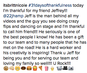 Britt Nicole recently shared that she was thankful for her dancer, Jeff! Jeff is not only a phenomenal dancer, but he is also a wonderful photographer/videographer. All of those awesome videos for each concert performance… all of those youtube VLOGS? Those were filmed and edited together by the talented man above! 🙂 Check out Britt’s sweet post for him below!