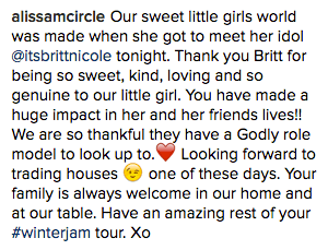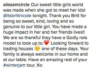 Britt Nicole Performs in Ontario, CA (Winter Jam Show #2) November 13, 2016June 27, 2019 Jaymie Nicole Britt Nicole performed in Ontario, CA on November 10th, 2016 on the 2nd night of the Winter Jam tour. Check out photos and videos from the evening below! 🙂 PHOTOS VIDEOS View this post on Instagram #WINTERJAM2016 @itsbrittnicole 🙌🏼 A post shared by Toyota Arena (@toyota.arena) on Nov 10, 2016 at 10:25pm PST Share this: Click to share on X (Opens in new window) X Click to share on Facebook (Opens in new window) Facebook Like Loading... Published by Jaymie Nicole View all posts by Jaymie Nicole Post navigation Previous postBritt Nicole Kicks Off Winter Jam Tour in Rio Rancho, NMNext postBritt Nicole Performs in Glendale, AZ (Winter Jam Show #3) Leave a comment Cancel reply Δ