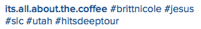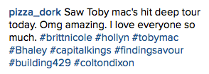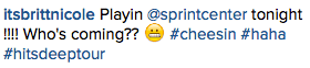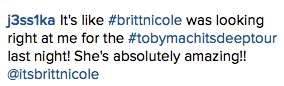 Britt Nicole spent a day relaxing at PT’s Coffee Roasting Company in Kansas City, Missouri before hitting up the Sprint Center for the 20th show of the Hits Deep tour. Check out some photos and videos from this epic show below! 🙂