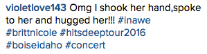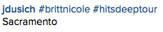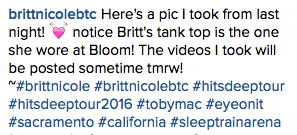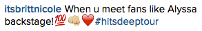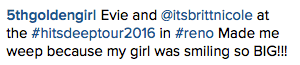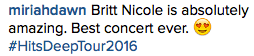 YOU ARE FABULOUS. 💖 I LOVE YOU. @itsbrittnicole #hitsdeeptour2016 #brittnicole pic.twitter.com/ZDYUGOeoNE— ✞ munchKIN 🙂 (@kinzifyfe) March 7, 2016