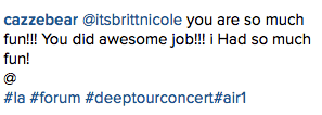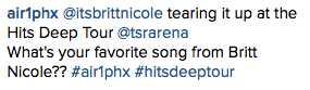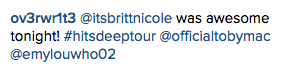 @itsbrittnicole your voice wow. so amazing britt!! hope I can see you after💛❤️💛 pic.twitter.com/dAhprDsf3J— pam (@coronado625) February 29, 2016