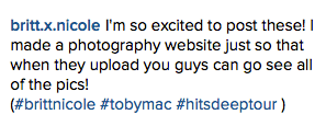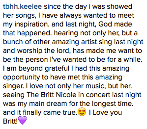 Having so much fun at the Toby Mac concert with Britt Nicole!! Love you britt❤️ @itsbrittnicole pic.twitter.com/1BvB44G3Hx— Amber (@flowergirl1023) February 29, 2016