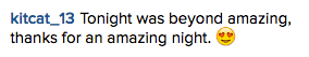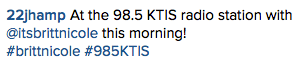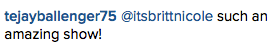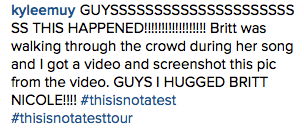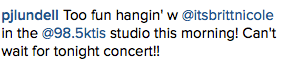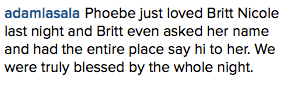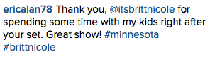 My husband and I arrived at the show at about 5:15 p.m. The venue told us to arrive an hour before the doors opened due to traffic and construction. After we parked, we basically just sat in our car for an hour because it was pouring rain. While we were waiting, my phone went off. It said that I had a new message. It was from Britt’s husband Josh! He asked if my husband and I were going to be at the show tonight and then said that he and Britt would love to meet us and that he would bring us backstage after the show! I couldn’t believe it… to say that I was excited would be an understatement! 🙂