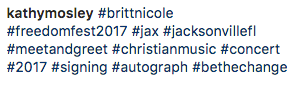 On June 3, Britt Nicole and her team headed to Jacksonville, Florida to perform at Freedom Fest Jax. The goal of Freedom Fest Jax was to raise awareness and money to help those who have been through human trafficking. A few of my friends were at the show and had a BLAST! Check out some photos and videos below! π