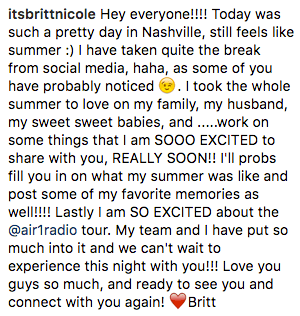 As most of you may have noticed, Britt Nicole took a break from social media for the entire summer to spend time with her family and work on some other things. This is also the reason that we have not been as active either. But, now we are back! π Check out Britt Nicole’s latest social media post explaining her absence and some exciting news!