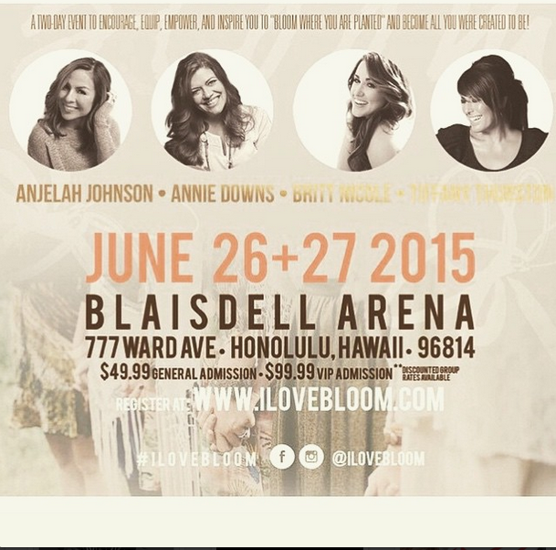 Britt Nicole, her family, and team have arrived in Honolulu, Hawaii for the BLOOM Conference that will take place today, June 26th, and tomorrow, June 27th. Britt Nicole will be performing an acoustic set for the women of the conference. I am sure she will also share some words of encouragement and wisdom as always. 🙂