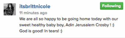 As some of you may know, most of Tennessee and the surrounding areas have been shut down due to a winter storm passing through. Britt Nicole has been safe inside snuggling up with her little ones. She took the time to post these two new photos of Adin & Ella. So adorable! π