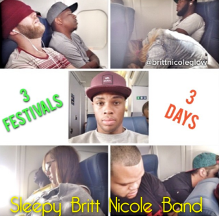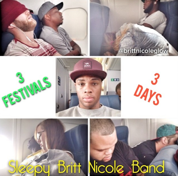 Britt Nicole’s team has been working hard. 3 festivals in 3 days plus long flights = an extremely tired Britt Nicole Band! In case you are wondering, Britt Nicole is in the top right photo leaning on the airplane tray table sleeping. ๐