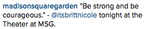 Last night, Britt Nicole checked off an item that is on the majority of artist’s bucket lists… performing at Madison Square Garden! 🙂 It sounds like it was a fantastic show based on the photos and videos! Be sure to check them out below!