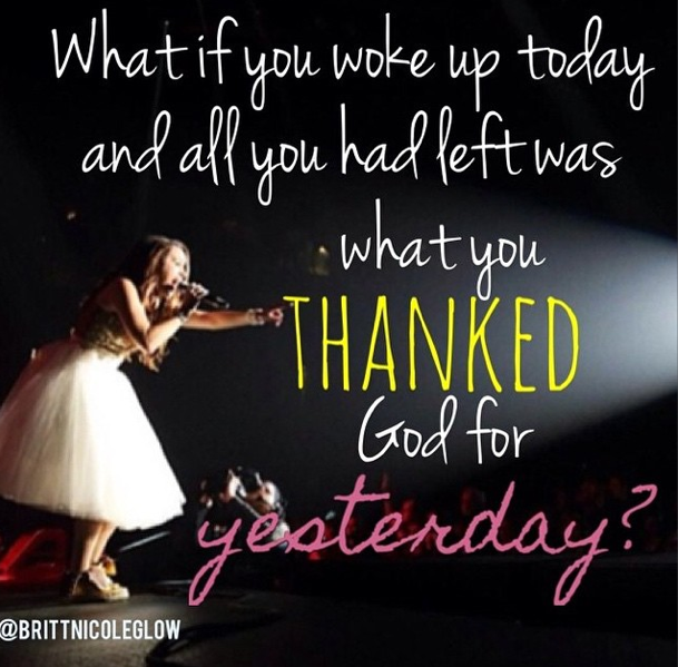 I love this quote! It definitely reminds us to be thankful EVERY DAY… not just on Thanksgiving. What are you most thankful for? I am thankful for God who gives me grace even when I don’t deserve it, my wonderful husband, my family, my friends, my job, my students, a warm home to live in… and of course for Britt Nicole because she reminds me to spread the love of Jesus wherever I go and to shine for him in all situations! I’m also thankful for YOU, the fans of Britt Nicole! π Happy Thanksgiving!