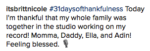 Yesterday Britt Nicole shared that she is thankful for the ability to spend quality time with her family recently. They are such a sweet family, and they handle the craziness of life so well for what is thrown at them! 🙂Â